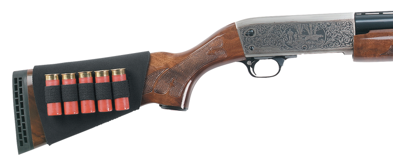 This neoprene buttstock shell holder mounts directly to shotgun buttstock to securely hold up to 5 rounds of ammunition. The smooth neoprene construction provides a secure grip while remaining lightweight and durable. Designed for easy access to spare ammunition during shooting activities.