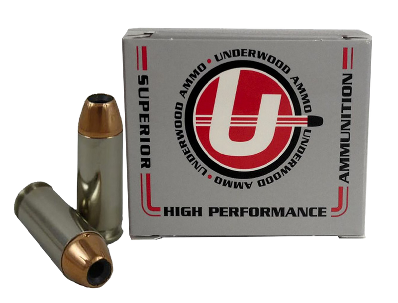 Underwood Sporting ammunition in 10mm Auto features a 135-grain Jacketed Hollow Point bullet with a muzzle velocity of 1600 fps and muzzle energy of 768 ft-lbs. This new production, non-corrosive ammunition uses Nickel-Plated Brass boxer-primed reloadable cases and is suitable for medium game hunting. Each box contains 20 rounds.