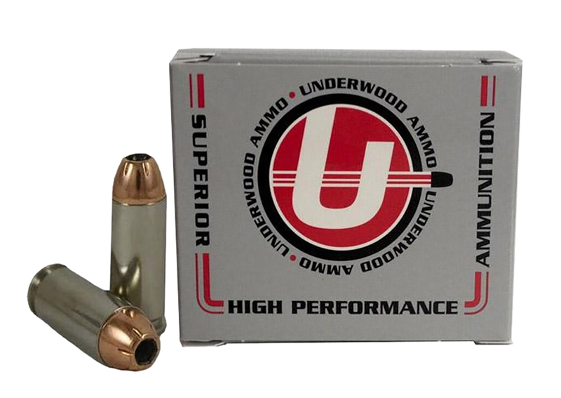 Underwood Ammo 10mm Auto ammunition featuring 200-grain XTP Jacketed Hollow Point bullets with a muzzle velocity of 1250 fps and muzzle energy of 694 ft-lbs. This new production, non-corrosive ammunition is loaded in nickel-plated brass boxer-primed reloadable cases and comes in boxes of 20 rounds, with 10 boxes per case.