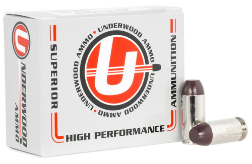 Underwood 45 ACP+P ammunition features 255-grain hard cast flat nose bullets designed for medium to large game hunting and defense. This load delivers 925 fps muzzle velocity and 485 ft-lbs of energy from nickel-plated brass cases with boxer primers. Each box contains 20 rounds, with 10 boxes per case.