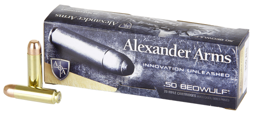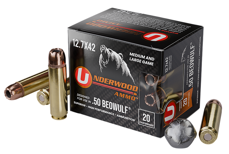 Underwood 50 Beowulf ammunition loaded with 350-grain XTP jacketed hollow point bullets at 1775 fps muzzle velocity, delivering 2449 ft-lbs of energy. This new production, non-corrosive ammunition features reloadable boxer-primed brass cases and is designed for hunting medium to large game. Packed 20 rounds per box, 10 boxes per case.