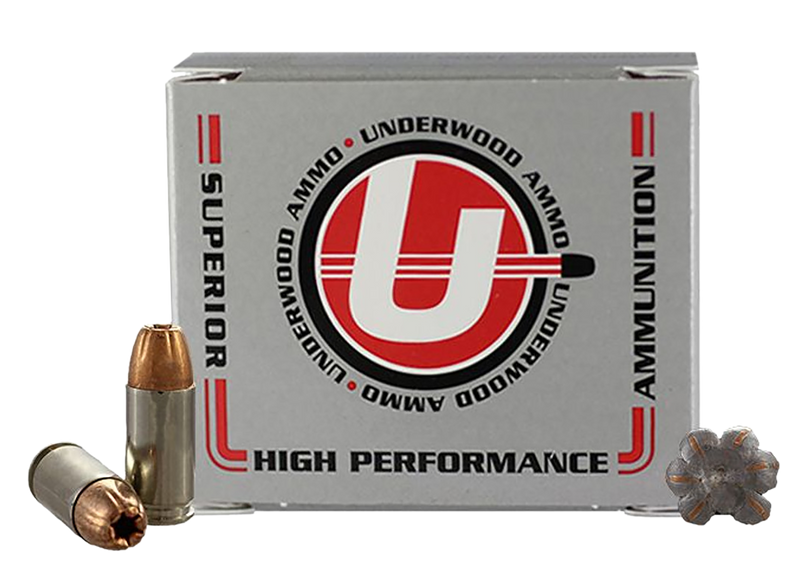 Underwood 9mm Luger ammunition loaded with 124 grain Jacketed Hollow Point bullets designed for personal defense and hunting applications. Muzzle velocity is 1150 fps with 364 ft-lbs of energy, housed in nickel-plated brass boxer-primed reloadable cases. Packaged 20 rounds per box, 10 boxes per case.