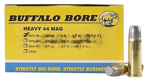 .44 Remington Magnum handgun ammunition loaded with 305 grain lead flat nose gas check bullets. This new production, boxer-primed ammunition achieves 1325 fps muzzle velocity and 1189 ft-lbs of energy from a nickel-plated brass reloadable case, suitable for medium to large game hunting.
