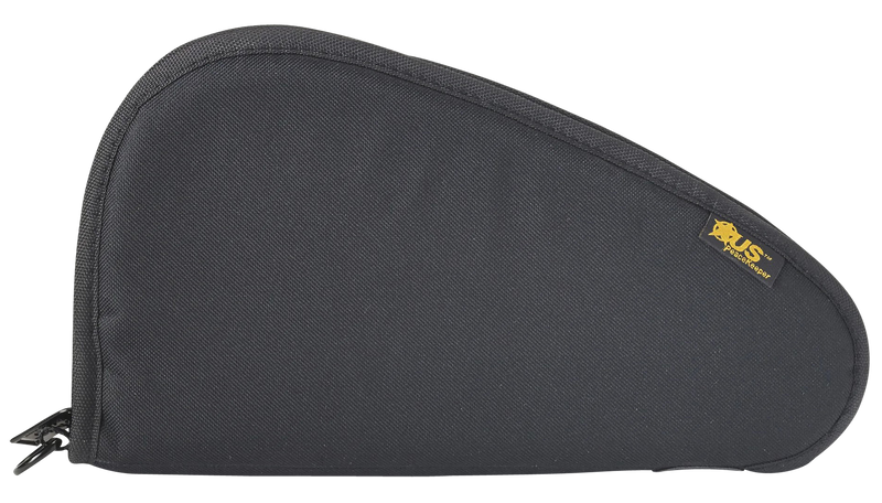 This US PeaceKeeper pistol case is designed to hold a single handgun and features 600 denier polyester construction with protective padding. The case includes a D-ring for attachment, lockable design for security, and measures 11.5" x 7.3" x 1.9".