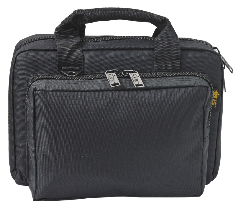 This is a compact range bag designed to carry firearms and accessories, measuring 12.75" L x 8.75" H x 3" D. Constructed from water-resistant 600D polyester with 8 magazine pockets, lockable zippers, wraparound handles, and crushproof padding for secure transport.
