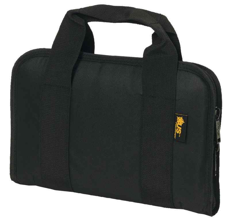This US PeaceKeeper Attache Case is a compact 13.5" x 9" x 1.8" pistol case constructed from durable 600D polyester with 1.25" padding for protection. Features a heavy-duty zipper, lockable design, and storage for a handgun and up to 5 magazines.