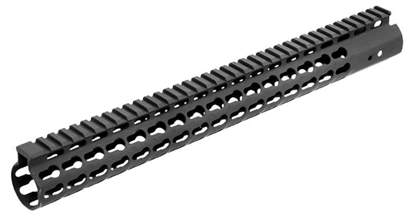 Free-floating aluminum handguard designed for AR-15 rifles with a 15" length and black anodized finish. Features KeyMod slots and integrated Picatinny rail for mounting accessories, with a slim profile for reduced weight and improved ergonomics.