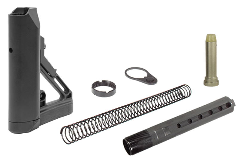 This is a complete mil-spec buttstock kit compatible with AR-15 and M16 platforms, constructed from polymer with an aluminum tube. The kit includes a 6-position adjustable stock, extension tube, buffer, buffer spring, tear-drop ring, and castle nut for a complete installation.