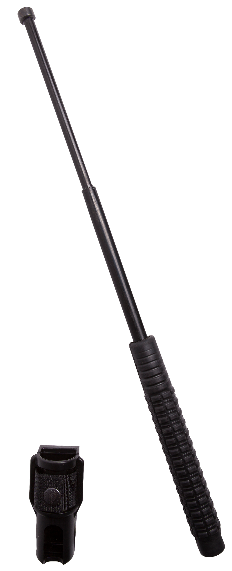 This 21-inch expandable baton extends from a compact 8.25" closed length and is constructed of hardened steel with a rubber grip for secure handling. It includes a holster for convenient carry and is designed for law enforcement and self-defense applications. The baton weighs 15 oz and is finished in black.