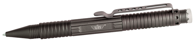 The Uzi Defender Tactical Pen is a 6.10" self-defense tool constructed from gun metal aluminum, designed for personal protection in compact form. It functions as both a writing instrument and emergency defense device, weighing 1.60 oz for everyday carry. The pen features a tactical design suitable for self-defense situations where a discreet tool is preferred.