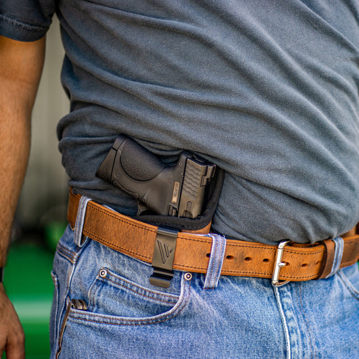 Inside-the-waistband leather holster designed for compact and full-size pistols with a minimalist profile and easy on/off belt clip. Features ultra-plush padded back, soft interior leather protection, and vegetable-tanned water buffalo leather construction made in the USA. Includes lifetime warranty and is designed for standard 1.5" wide carry belts.