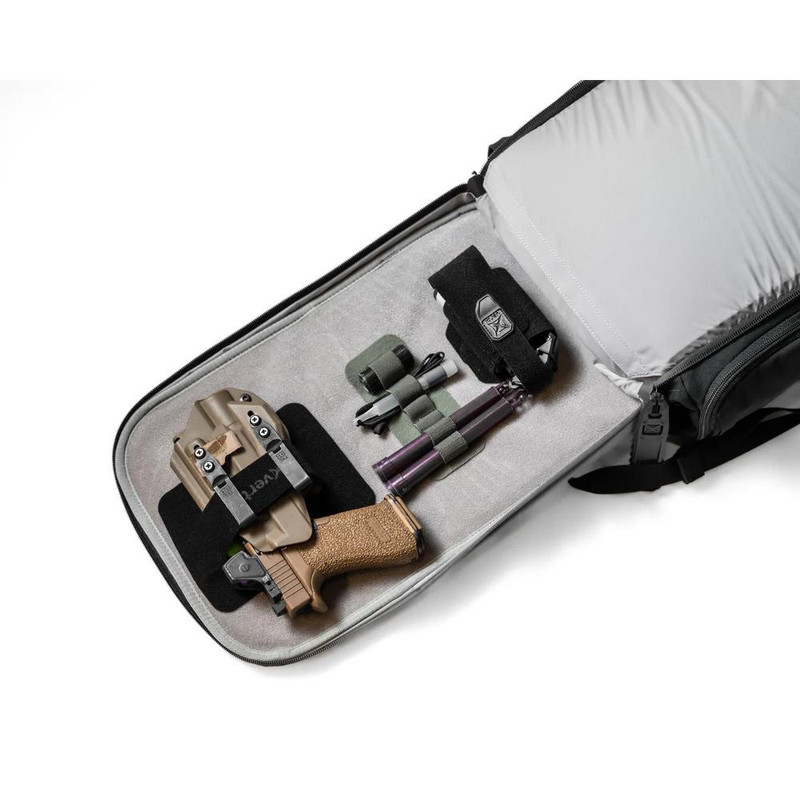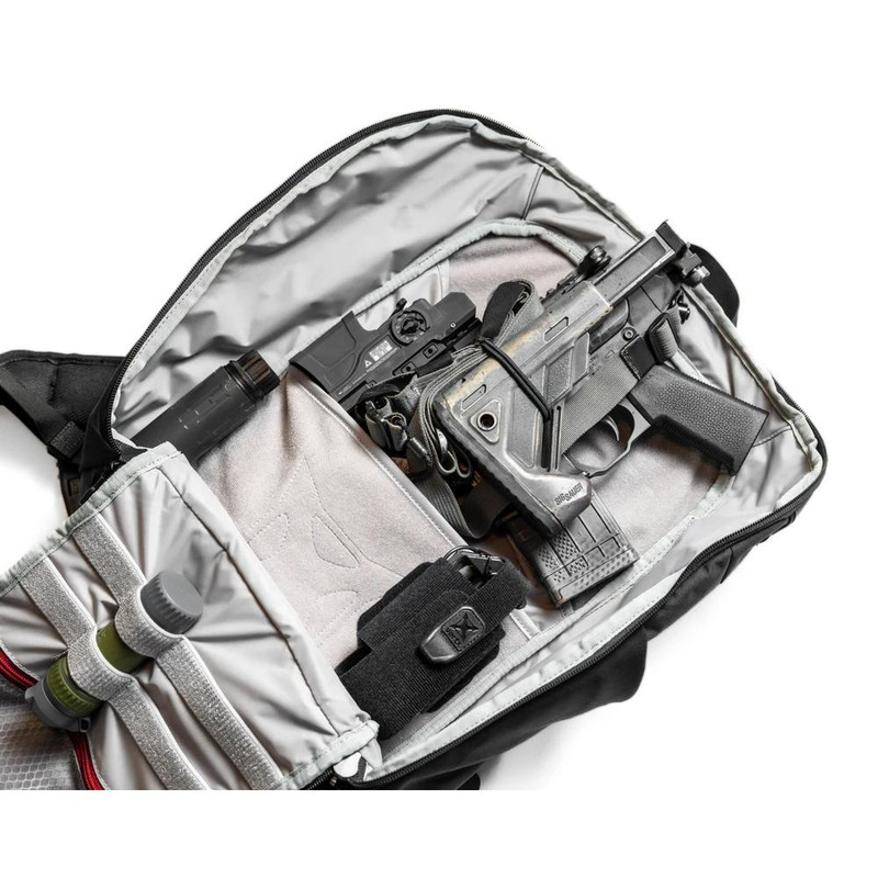 The Gamut 26L is an everyday carry backpack featuring a dedicated CCW compartment with integrated BAP strap for secure concealed carry access. It includes customizable rapid access pull tabs, a stowable gear sling, and hidden storage pockets for documents or sensitive items. The pack is designed for EDC and commute use with multiple organization options.