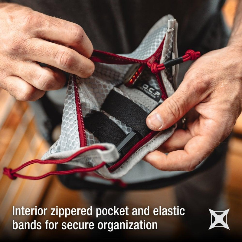 The Vertx SOCP Lt Overflow Pouch is a compact accessory holder designed for range use and tactical storage. Features include a high-visibility red zipper, interior zippered pocket for tools, vertical elastic bands for organization, and a durable hook-back panel with loop strip storage. Constructed with quality YKK zippers and measuring 10" x 7.25" when packaged.