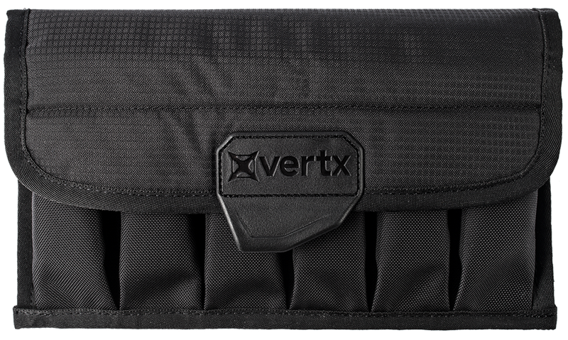 This Vertx magazine pouch holds up to 12 single stack or 6 double stack magazines in a compact 11" x 5.5" x 1.5" configuration. Constructed from durable black Cordura material, it provides reliable protection and organization for ammunition storage. The pouch features six individual compartments for secure magazine retention.