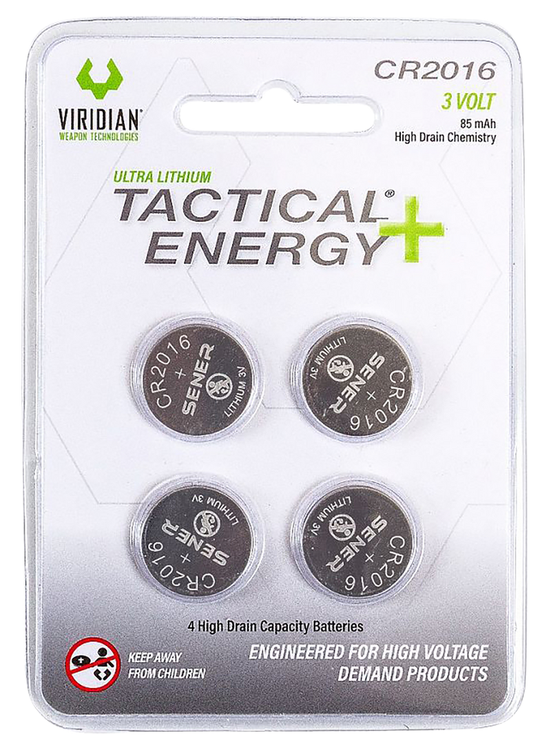 Four-pack of CR2016 lithium coin cell batteries designed for tactical equipment and compact devices. Each battery delivers 3.0 volts at 85 mAh capacity, providing reliable power for Viridian laser sights and similar accessories. Hazmat shipping applies; not available for air transport.