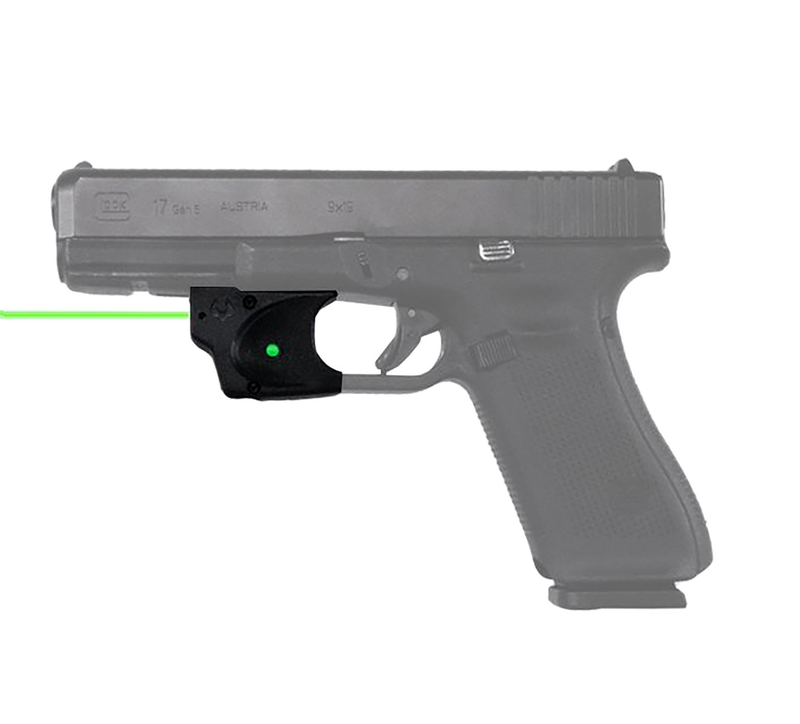 The Viridian E-Series is a trigger guard mounted green laser sight designed for Glock 17, 19, 22, 23, 34, 45, and 47 pistols. It features a 100-yard effective range during daylight and up to 2 miles at night, with a black polymer construction. The compact design measures 5.3" x 3.6" x 1.2" and provides quick target acquisition for defensive and tactical applications.