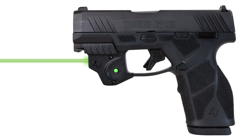 Green laser sight designed specifically for the Taurus GX2 pistol with trigger guard mount installation. Features an effective range of 100 yards in daylight and 2 miles at night. Built with black polymer construction for durability and quick target acquisition.