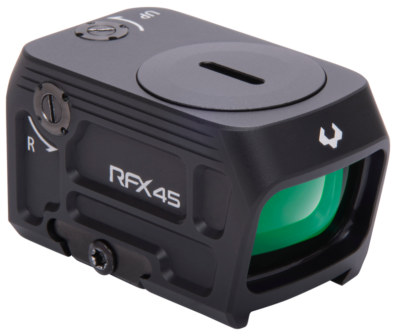 The Viridian RFX45 is a 1x magnification reflex sight with a 24x15.5mm objective lens and a 5 MOA green dot reticle. It features a fully multi-coated optical system, unlimited eye relief, waterproof construction, and includes an RMR footprint adapter for versatile mounting on ACRO-pattern slides.