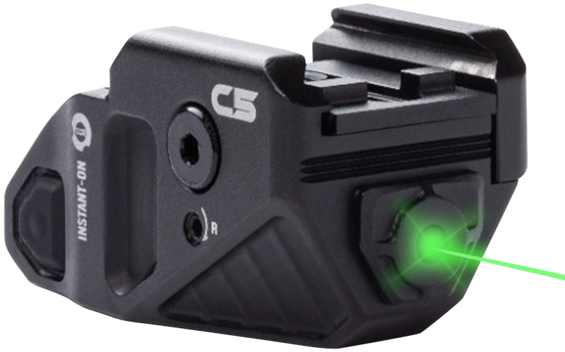 The Viridian C5 is a compact green laser sight featuring an internal rechargeable SAFECharge battery and Instant-On activation via ambidextrous buttons. With an effective range of up to 100 yards in daylight and 2 miles at night, it mounts universally on any rail system and is IPX-6 water resistant. The aluminum construction weighs 1.8 oz and includes a manufacturer limited lifetime warranty.