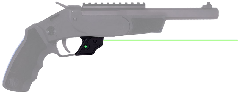 Trigger guard mounted green laser sight designed for concealed carry pistols, specifically fitting the Rossi Brawler and Tuffy models. Features ambidextrous on/off button with 5-minute auto shut-off, 100 yard effective range in daylight and 1 mile at night, powered by CR1/3N battery with approximately 1 hour runtime.