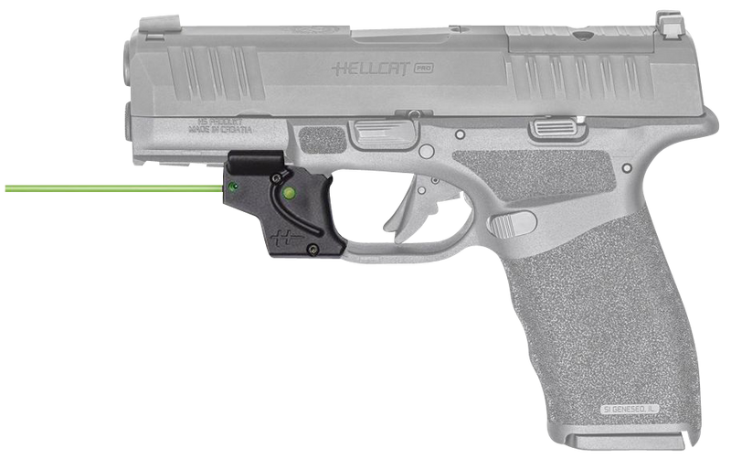 This trigger guard-mounted green laser sight is designed specifically for the Springfield Armory Hellcat Pro and features an ambidextrous on/off button with 5-minute auto shut-off. The laser delivers a 100-yard effective range in daylight and extends to 2 miles at night, with approximately 6+ hours of battery runtime on two 1/3N batteries. Installation is tool-free directly onto the pistol's trigger guard, making it ideal for everyday concealed carry applications.