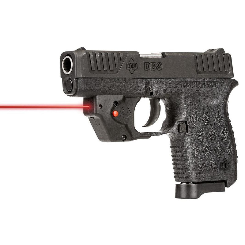 This trigger guard-mounted red laser sight is designed for concealed carry pistols, specifically the Diamondback DB380 and DB9 models. It features ambidextrous on/off controls, a 5-minute auto shut-off function, and delivers 25 yards of effective range in daylight with up to 1 mile visibility at night. The laser offers 6+ hours of battery life with constant activation.
