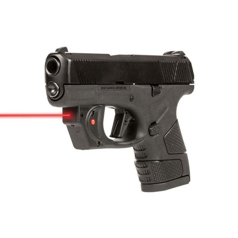 This trigger guard mounted red laser sight is designed for concealed carry pistols and offers rapid target acquisition in low-light conditions. It features an ambidextrous on/off button with 5-minute auto shut-off, 25-yard effective range in daylight and 1-mile range at night, and over 6 hours of battery life. The sight delivers the maximum legally available red laser power for quick target location when needed.