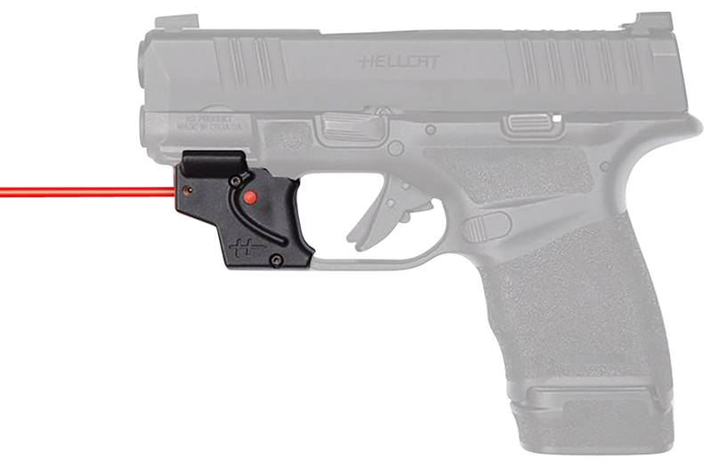 Trigger guard mounted red laser sight specifically designed for the Springfield Hellcat with 25 yard daylight range and 1 mile night visibility. Features ambidextrous on/off button with 5 minute auto shut-off, adjustable windage and elevation, and approximately 6+ hours of battery runtime. Uses a 1/3N battery and delivers 650 nM wavelength red laser for rapid target acquisition.