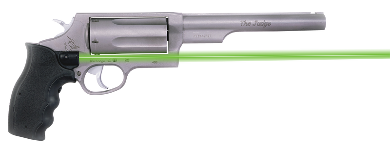 This grip laser attaches to a Taurus Judge revolver and projects a green laser for improved targeting and accuracy. It features IPX-4 waterproofing, a rechargeable LiPo battery with approximately 4 hours of runtime, and comes with a manufacturer's limited lifetime warranty. The ergonomic design integrates seamlessly with the firearm's grip while maintaining overall handling and control.