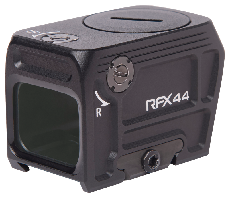 The Viridian RFX44 is a compact reflex sight featuring a 1x magnification with a 44mm objective lens and 5 MOA green dot reticle designed for rapid target acquisition. It includes an RMR adapter for compatibility with standard footprints, offers unlimited eye relief, and features 10 brightness settings with 2 night vision compatibility. The sight is waterproof (IPX-6), has a battery runtime of 30,000 hours, and provides 60 MOA windage and 90 MOA elevation adjustments.