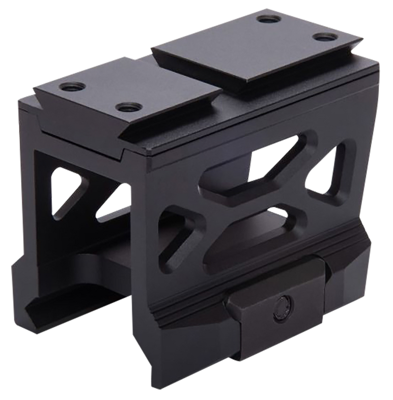 This is a high-profile Picatinny rail adapter mount designed for the Viridian RFX45 closed emitter green dot reflex sight, providing 1/3 lower co-witness capability. Manufactured from 6061-T6 aluminum with black anodized finish, it offers a secure mounting solution for tactical and sporting applications. The adapter is compatible with standard Picatinny rail systems and ACRO footprints.