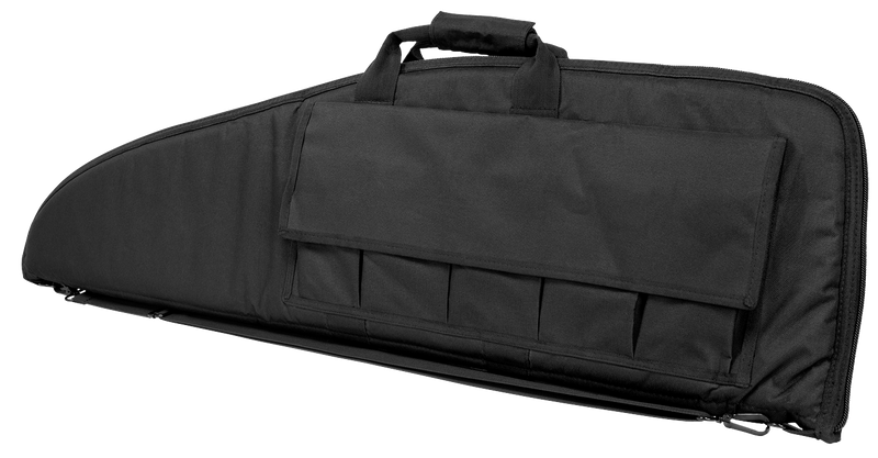 This NcSTAR VISM rifle case measures 40 inches long by 13 inches wide and is constructed from durable PVC nylon material with foam padding for protection. Features include double zippers, a carry handle, ID holder pocket, and heavy-duty hardware designed to safely transport and protect rifles during storage and transport.