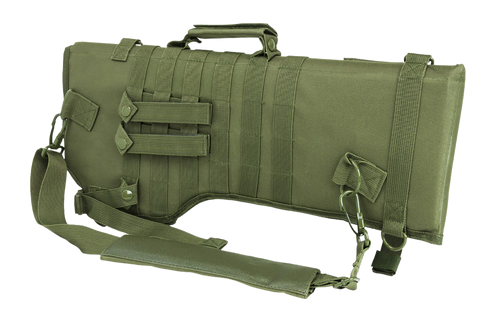 NcSTAR tactical shotgun scabbard designed for 29" shotguns, constructed from durable nylon with six metal D-ring attachment points. Includes a padded shoulder sling for comfortable carry and transport.