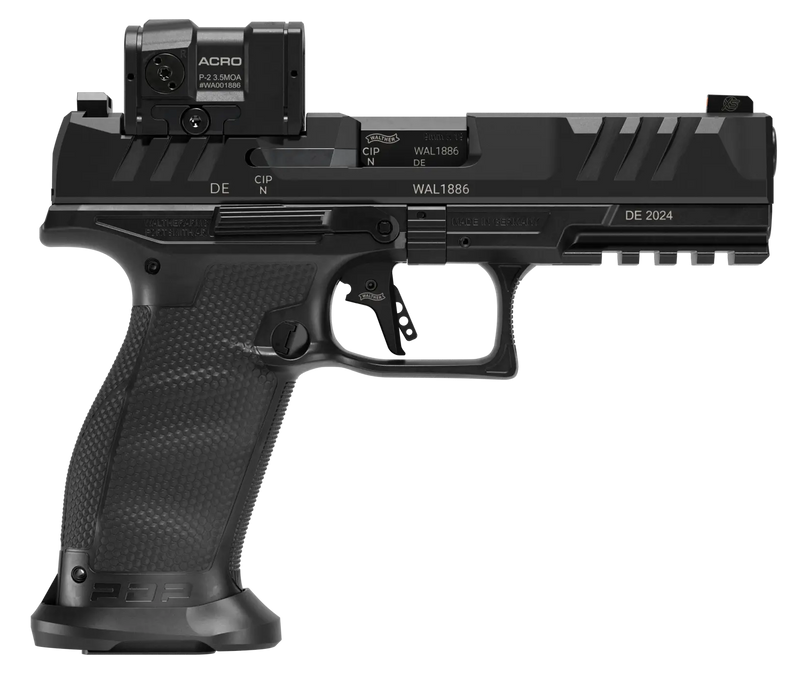 The Walther PDP Pro is a 9mm striker-fired semi-automatic pistol with a 4.5" barrel and 10+1 round capacity. The slide is direct milled to accommodate the Aimpoint ACRO optic system for enhanced target acquisition. Features include a dynamic performance trigger, performance duty textured grip, adjustable white dot sights, and weighs 27.5 oz.
