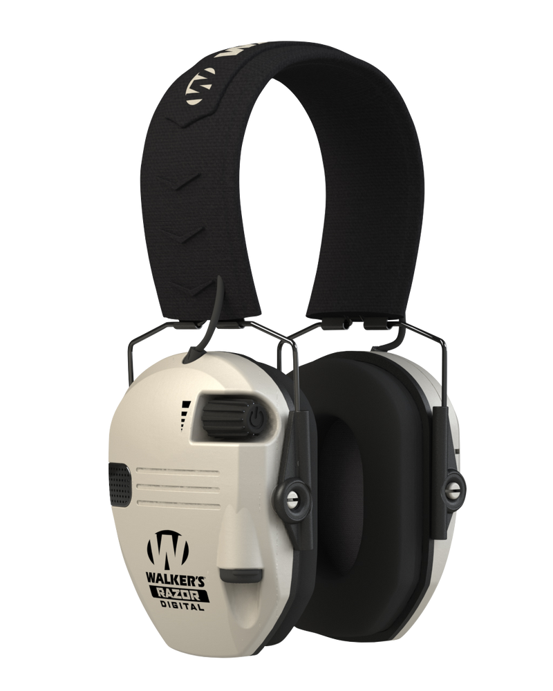 Walker's Razor PRO Digital Electronic Earmuff provides 23 dB noise reduction rating with over-the-head design for shooting and hunting. Features digital amplification technology with AAA battery operation and bone/black polymer construction for durable, lightweight hearing protection.