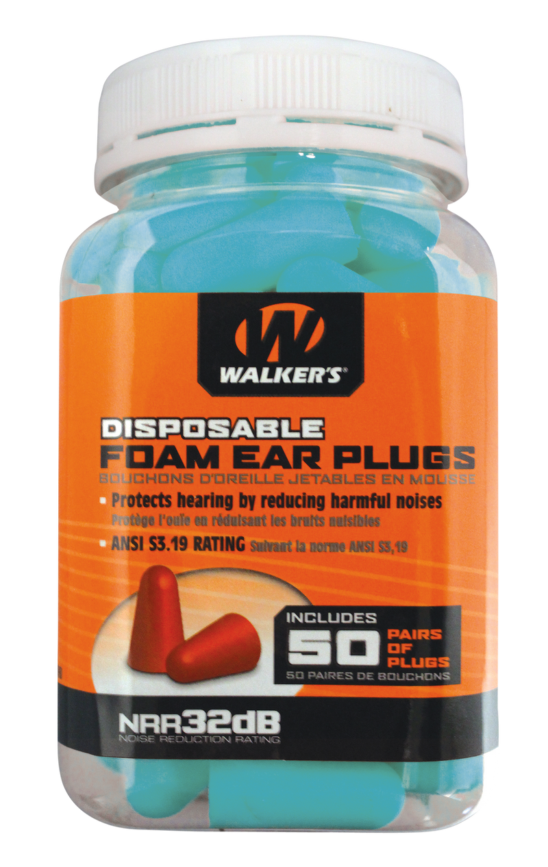 Walker's foam earplugs provide 32 dB noise reduction rating (NRR) for hearing protection during shooting and loud activities. These in-the-ear plugs come in a pack of 50 pairs and feature a teal color for easy visibility. Made from foam material for comfort and effective noise attenuation.