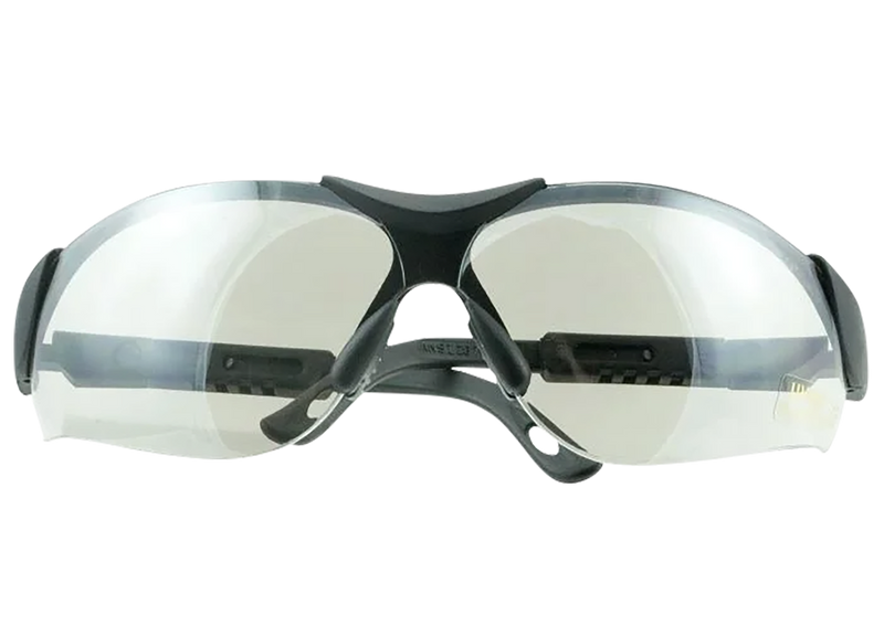 Half-frame shooting glasses with clear polycarbonate lenses and anti-fog coating, designed for sport and tactical use. Features UV protection (99%), ANSI Z87.1 rating, soft rubber nose piece, and 5-position adjustable temples for a customizable fit. Includes one pair with black frame.