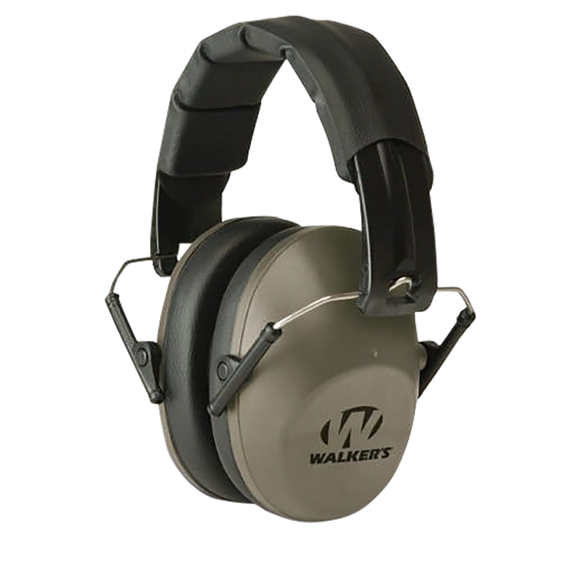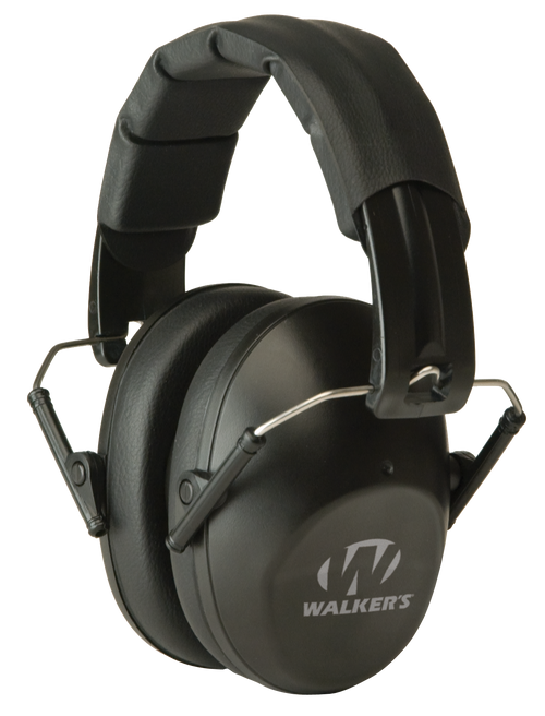 Walker's passive earmuff offering 22 dB noise reduction rating (NRR) with a low-profile contoured cup design and padded headband for comfortable extended wear. Features ANSI S3.19 rated protection, soft PVC ear pads, ultra-lightweight polymer construction, and compact folding design for portable storage and transport.