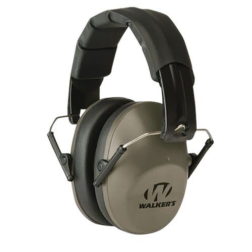 Walker's passive earmuff designed for hearing protection with a 22 dB noise reduction rating (NRR). Features a low-profile contoured cup design, padded headband, soft PVC ear pads, and compact folding construction for portability and storage. ANSI S3.19 rated and ultralight weight for comfortable extended wear.