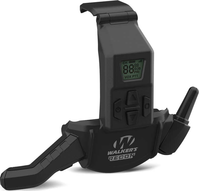 The Walker's Recon Bluetooth Electronic Ear Muffs provide 26dB noise reduction rating with sound-activated compression to block harmful gunshot noise while amplifying ambient sounds like conversation and footsteps up to 6 times. Featuring integrated Bluetooth 5.0 connectivity, digital audio circuit, and full-range HD speakers, these professional-grade electronic muffs are designed for shooting, hunting, and work environments. The muffs are compatible with Walker's Recon system and include 22 GPRS radio channels for communication.