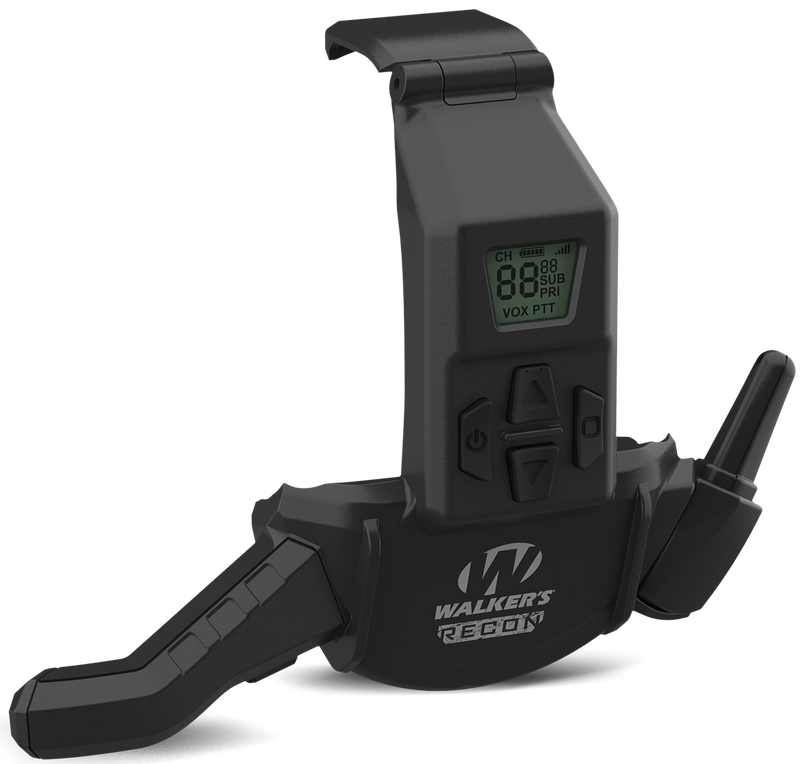 The Walker's Recon Hybrid Communicator is a Bluetooth 5.0 walkie talkie device that integrates with Walker's Recon Digital Muff series and provides access to 22 GPRS radio channels for hands-free communication. Features include push-to-talk, programmable voice activation, hi-gain omnidirectional boom microphone, and compatibility with the Walker's Link app for seamless connectivity during hunting.