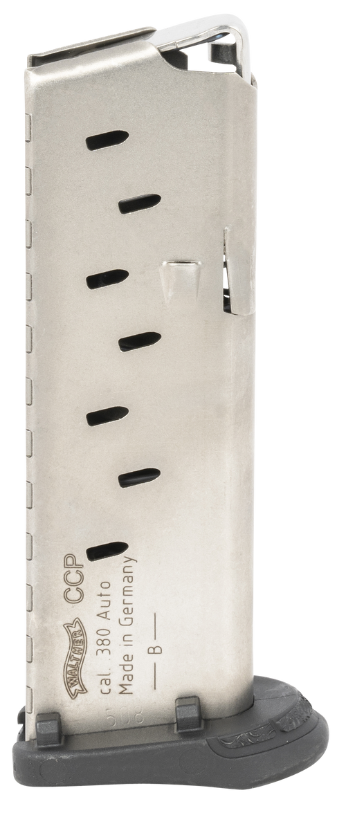 This is an 8-round detachable magazine designed for Walther CCP firearms chambered in 9mm Luger. The magazine features stainless steel construction with nickel plating and measures 8.4" in length.