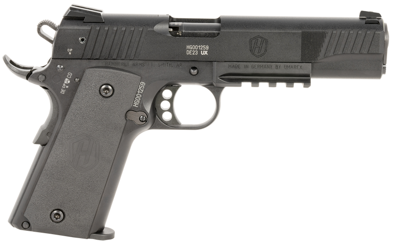 The Hammerli Arms Forge H1 is a full-size semi-automatic pistol chambered in .22 LR with a 5" threaded steel barrel and 12+1 round capacity. Features a black Cerakote serrated slide, black aluminum frame with beavertail grip safety, black polymer grip, and Picatinny rail. Weighs 34 oz empty with overall length of approximately 8.9" to 9.4".