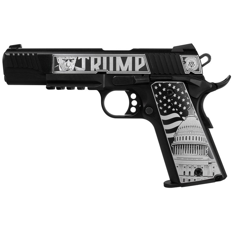 Semi-automatic .22 LR pistol with 5" barrel and 12-round magazine capacity. Features custom deep laser engraved grip and slide with "Trump 2024" design. Weighs 34 oz unloaded with overall length of 9.4"; includes 2 magazines.