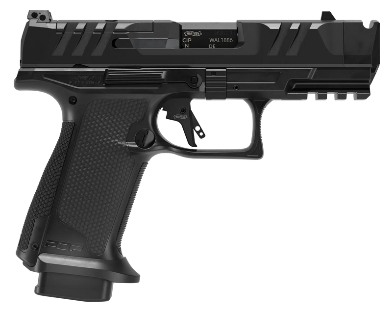 The Walther PDP F-Series Pro-X PMM is a 9mm striker-fired semi-auto pistol with a 3.5-inch threaded barrel and optics-ready slide. Developed in collaboration with Parker Mountain Machine, it features a polymer frame with performance duty textured grip, white dot adjustable sights, and a dynamic performance trigger. The compact design weighs 24 oz. and comes with a 10-round magazine capacity, making it suitable for everyday carry and duty use.
