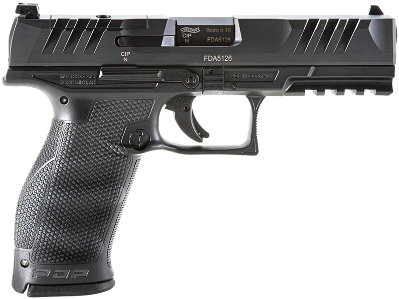 The Walther PDP is a full-size, striker-fired semi-automatic pistol chambered in 9mm Luger with a 4.5" polygonal rifled barrel and 18+1 round capacity. Features include an optic-ready serrated steel slide, black polymer frame with Picatinny rail, adjustable sights, and ambidextrous controls. The pistol weighs 25.4 oz and measures 8" overall length.