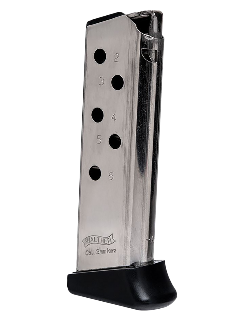 This is a 6-round detachable box magazine for the Walther PPK chambered in .380 ACP. Constructed from nickel-finished steel, it features a finger rest for improved ergonomics and handling. Serves as an OEM replacement magazine for the Walther PPK platform.