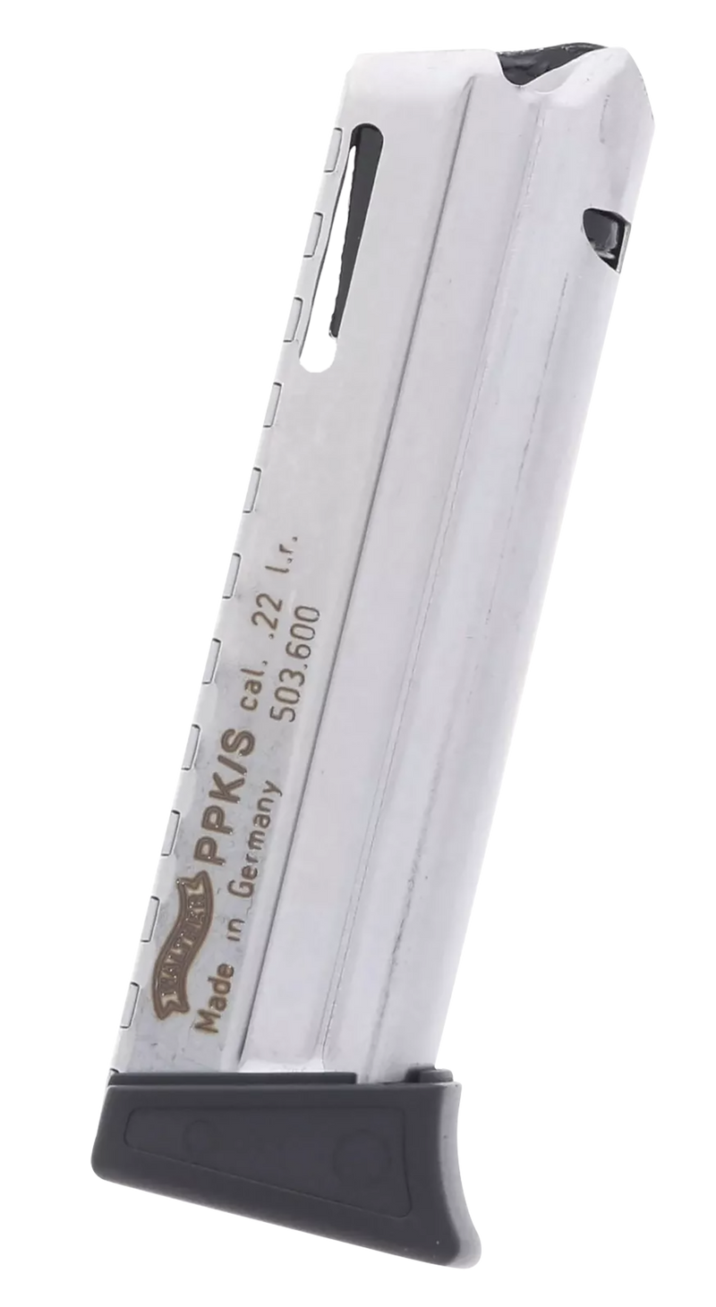 This is a factory Walther handgun magazine chambered in .22 LR with a 10-round capacity, designed specifically for the PPK/S pistol. It features a steel body with nickel plated finish and includes a polymer floor plate with finger rest for improved ergonomics and control.