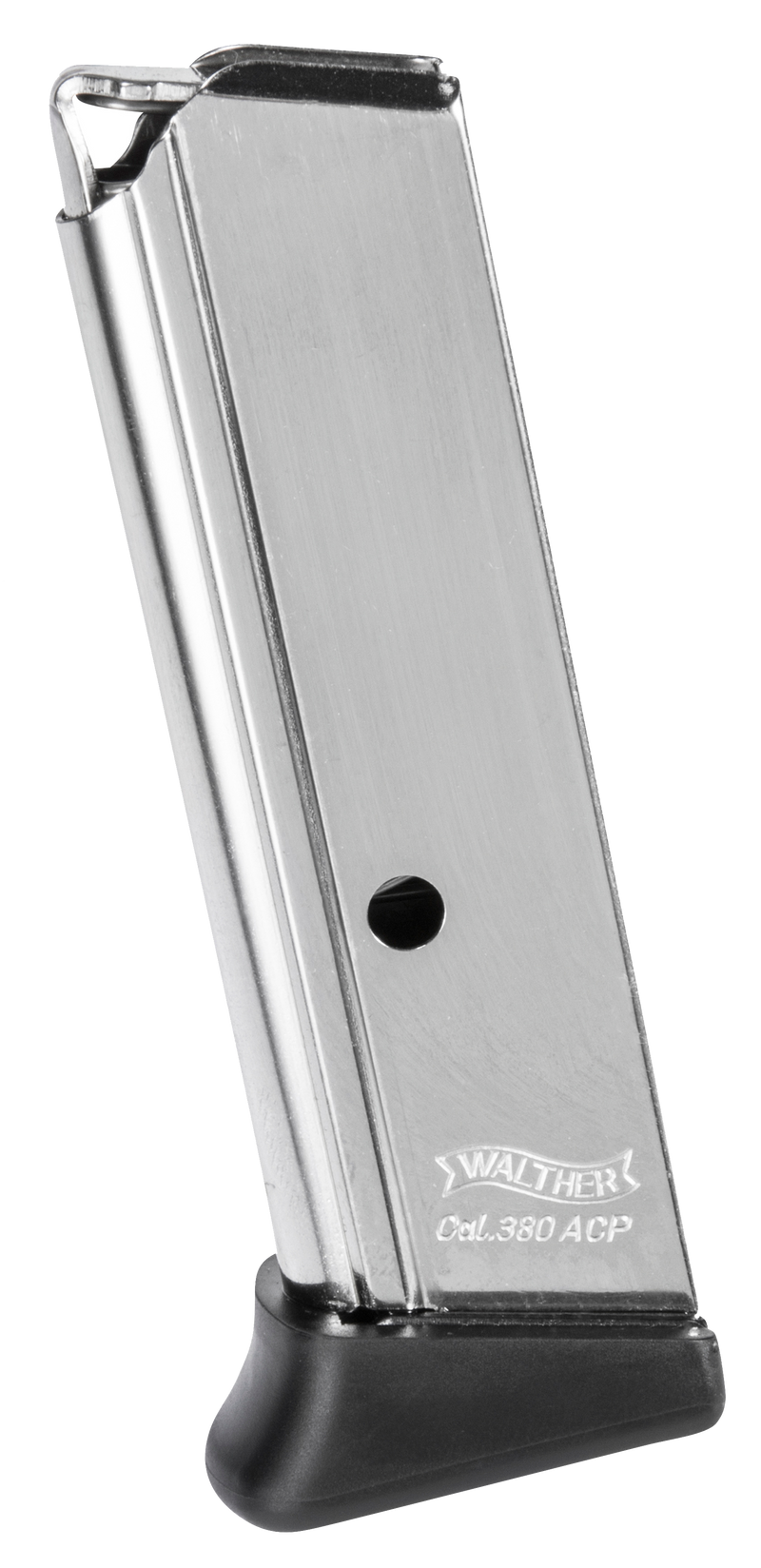 This is a 7-round detachable magazine for the Walther PPK/S chambered in .380 ACP. The magazine features a nickel-finished steel construction with an integral finger rest for improved grip and control. Compatible exclusively with Walther PPK/S pistols.