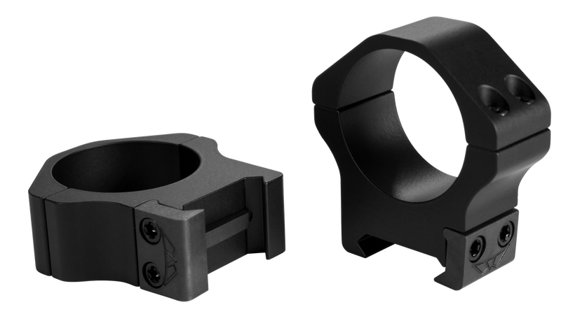 Two-piece fixed horizontal scope rings designed for 30mm tube diameter scopes with medium height. CNC machined from sintered steel with Picatinny/Weaver rail compatibility, featuring 4-screw ring caps, a recoil key, and clamp for secure installation with Warne's return to zero guarantee.